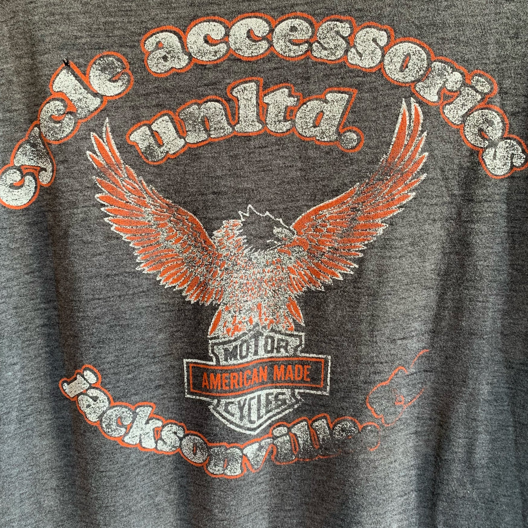 Amazing VTG Harley-Davidson Grail item. Early 80's 3D Emblem Eagle Tee with amazing Jacksonville, Fl back print. Single-stitch Vintage 1980's garment. Insane fade and wear. Worn right. Faded tag (L-XL). Small pin holes from wear. Super rare find.